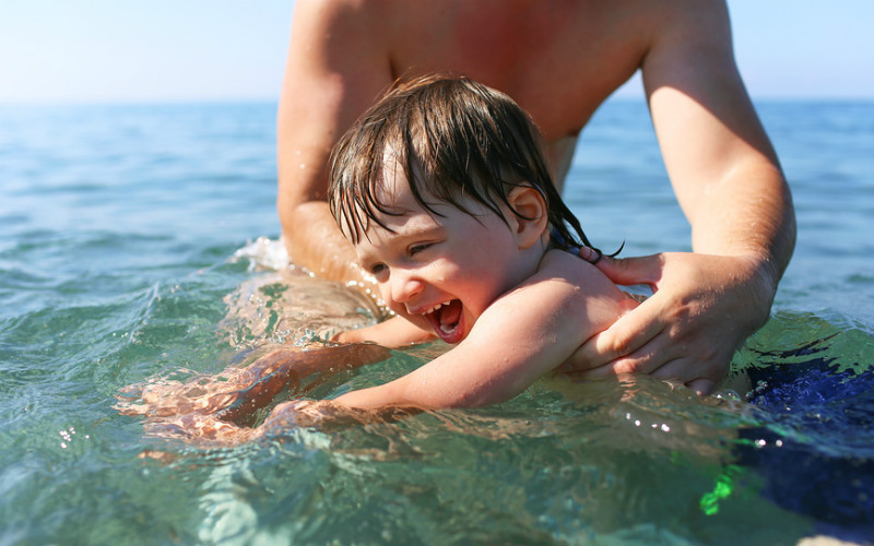 - Первым делом, подойдите к кромке воды с малышом и позвольте ему самостоятельно познакомиться с водной стихией. Если он не забоялся, то продолжайте постепенно заходить всё глубже.