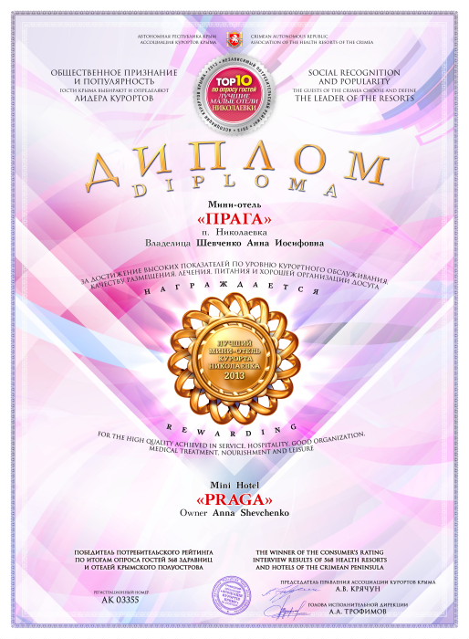 Мини-отель в Николаевке "Прага" награжден дипломом в номинации "ТОП 10 лучших малых отелей курорта Николаевка" по итогам независимого потребительского рейтинга, проведенного Ассоциацией курортов Крыма в период летнего сезона 2013 г.